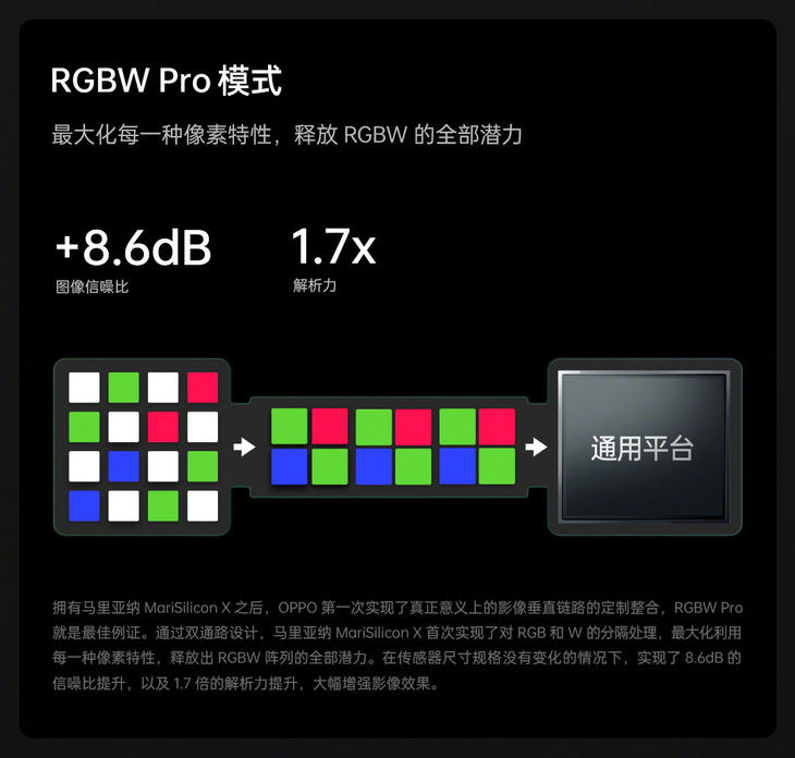 OPPO马里亚纳 X芯片支持RGBW Pro,可以更充分发挥RGBW的能力,通过双链路的设计和2x RAW计算,实现7.6倍信噪比和1.7倍解析力提升。