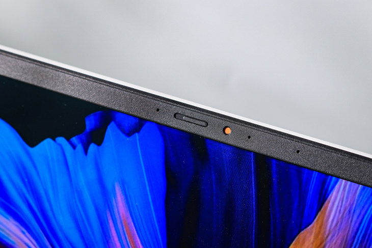 屏幕上边框配备有摄像头和麦克风识音口,便于会议视频等场景使用。特别是,它的摄像头配备了物理防窥遮罩,闭合后可以100%保证不会通过摄像头泄露隐私。