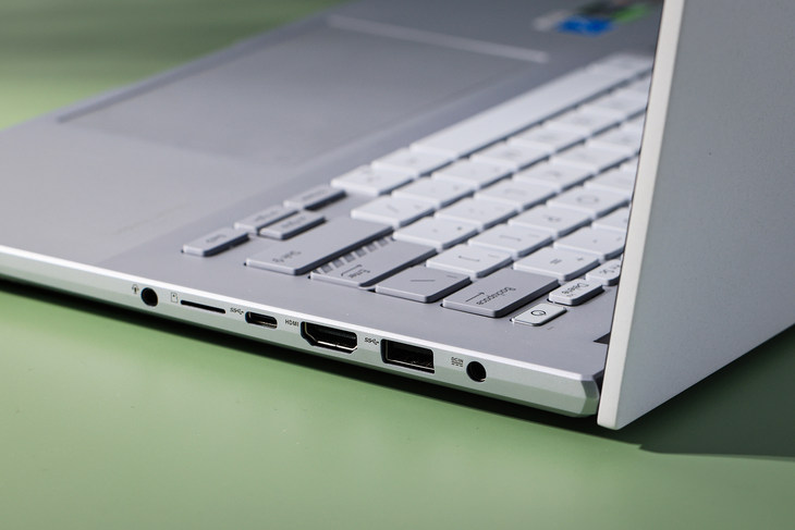 这款笔记本的机身右侧设计了电源接口、一个USB3.2接口、一个HDMI接口、一个Type-C接口,一个TF卡读卡器插槽、一个3.5mm耳机耳麦二合一接口。