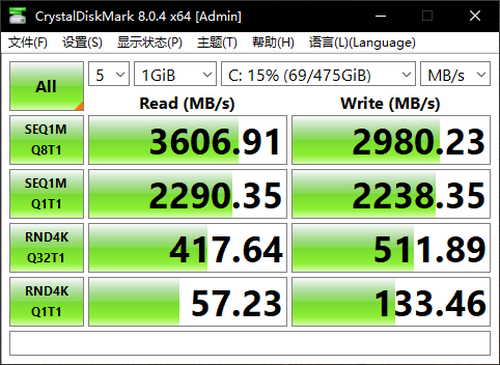 通过CrystalDiskMark这款测试软件的成绩来看,这块SSD相当出色,顺序读取速度超过了3600MB/s,顺序写入速度超过了2900MB/s。