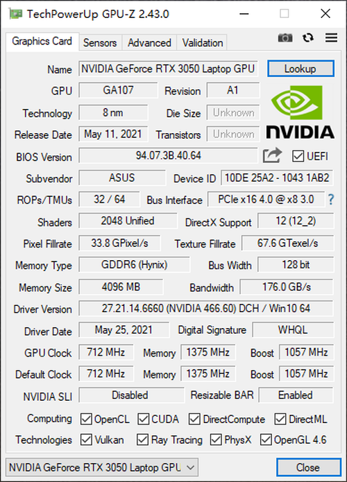 华硕灵耀Pro14的这款RTX3050笔记本电脑GPU的默认GPU频率为712MHz、Boost频率为1057MHz,显存频率为1375MHz(等效11000MHz)。