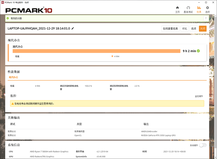 最终,这款笔记本在PCMARK 10现代办公续航项目测试中,实现了9个小时2分钟的成绩,表现很好,能够满足一整天强度较高的移动办公需求。