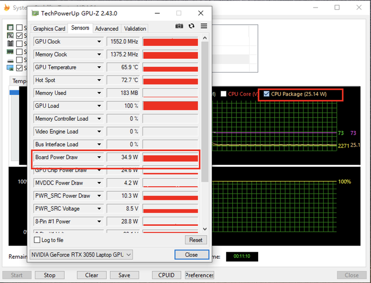 开启双烤机10分钟之后,这款笔记本的CPU温度稳定在了约73℃左右,频率稳定在了约2.27GHz,此时功耗约为25W。GPU温度温度稳定在了约66℃左右,此时功耗约为35W。