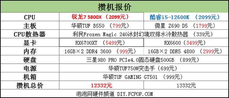 接下来,笔者分别为锐龙7 5800X与酷睿i5-12600K设计了两套攒机配置单,大家可以很明显的看出锐龙7 5800X在攒机性价比方面的巨大优势。