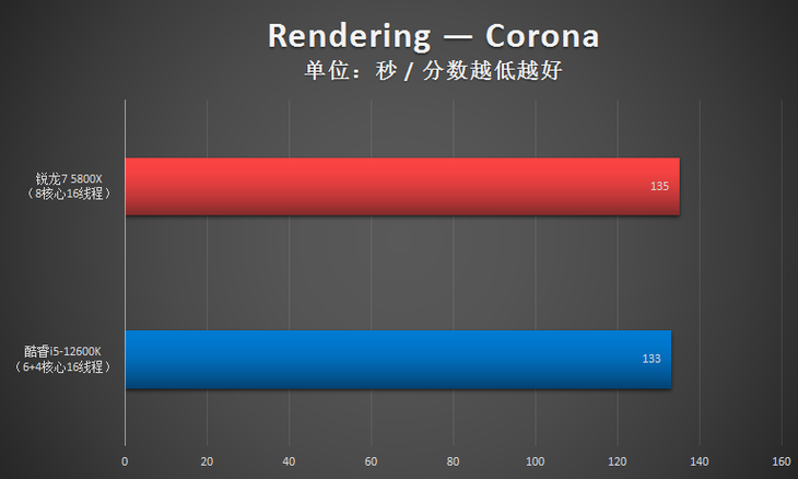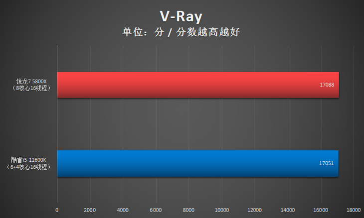 锐龙7 5800X是8核心16线程,酷睿i5-12600K是6+4核心16线程。虽然在核心数量方面,酷睿i5-12600K看似比锐龙7 5800X多一些,但是无论在全新的Win11系统里,还是在之前的Win10系统里面,12代酷睿“小核心”的性能表现都不太尽如人意。而锐龙7 5800X是成熟的ZEN 3架构设计,8核心效能出色,对比酷睿i5-12600K的时候表现依然令人欣喜。