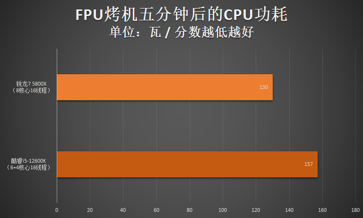 测试小结:凭借着成熟的7nm工艺制程,AMD锐龙7 5800X的满载功耗表现是要比酷睿i5-12600K低上不少的。