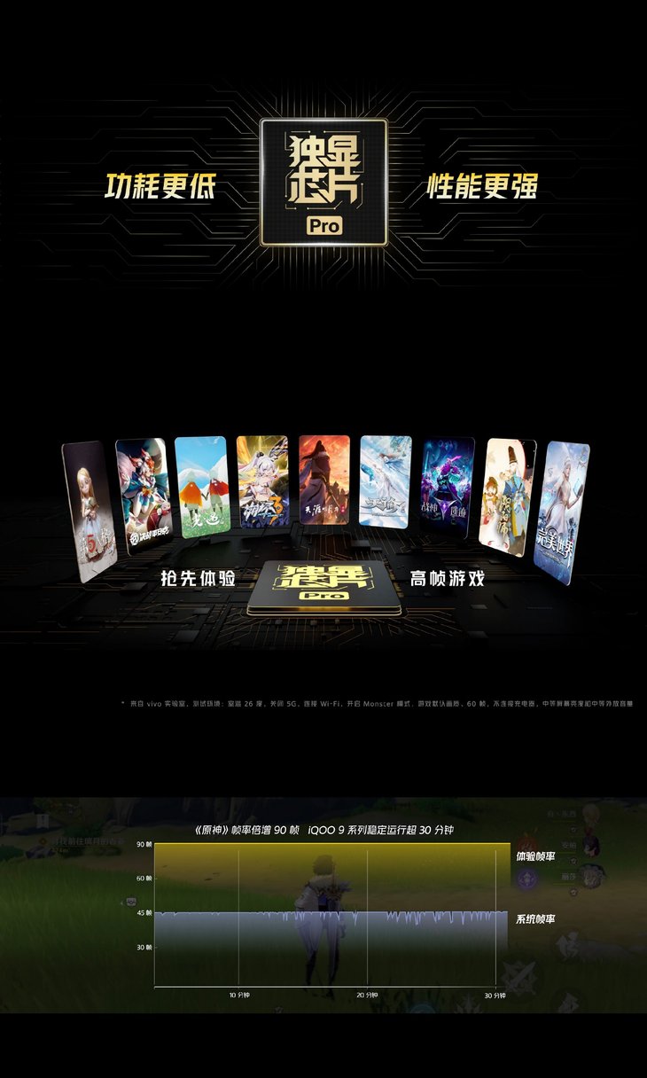 iQOO 9 Pro还搭载了升级版的独立显示芯片Pro,通过游戏插帧功能,能够把原生低帧率游戏画面提升到120帧,体验超越原生帧率的流畅画面,高帧游戏现已支持多款热门游戏。
