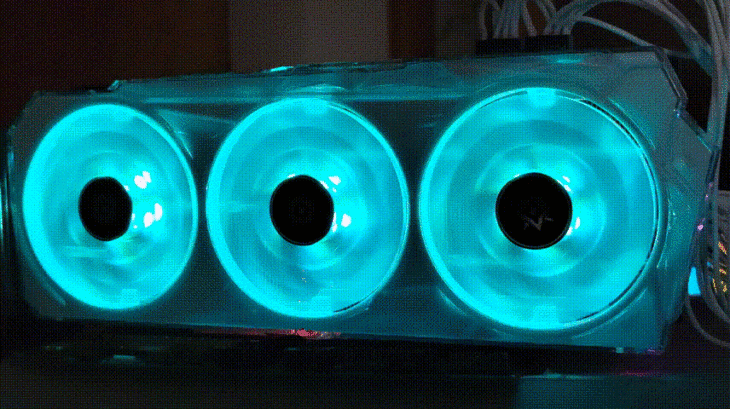 所以影驰 GeForce RTX 3080 星曜有3个90mm大风扇散热送风。透明的三折静霜扇叶进行了哑光处理,其通过空气动力学测试,能够输送顺畅风流,散热效果更出色。
