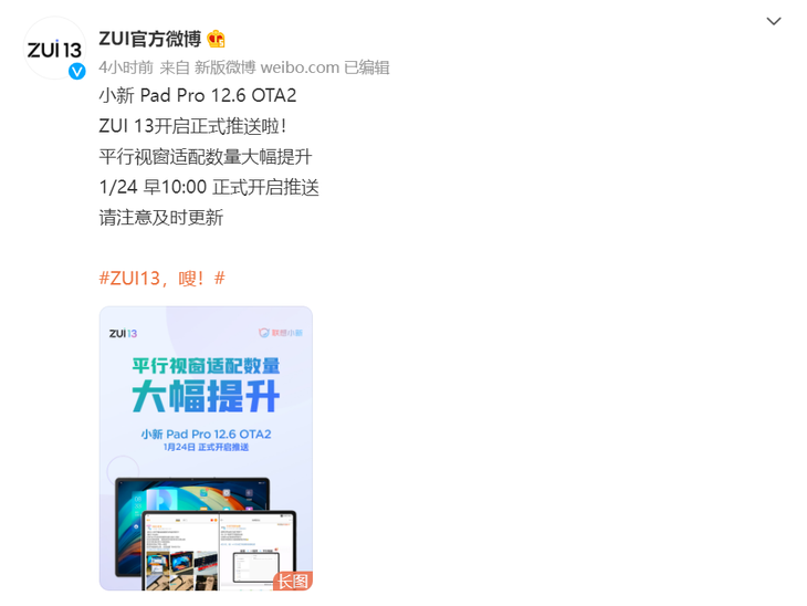 1月24日,ZUI官方微博官微宣布,小新 Pad Pro 12.6 OTA2 ZUI 13正式开启推送,新版系统的平行视窗适配数量大幅提升。