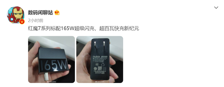 1月25日,@数码闲聊站在微博曝光了红魔7系列充电头,并表示会标配165W超级闪充。
