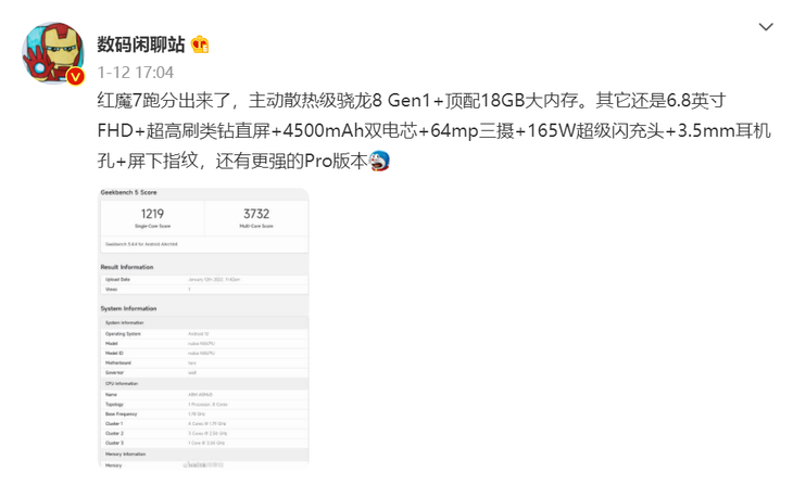 根据此前@数码闲聊站爆料信息,红魔7将会搭载主动散热级骁龙8 Gen1,顶配18GB大内存,配备6.8英寸FHD+超高刷类钻直屏,还有4500mAh双电芯电池、6400万像素三摄、3.5mm耳机孔、屏下指纹等配置加持。除了红魔7,还会有更强的Pro版本。