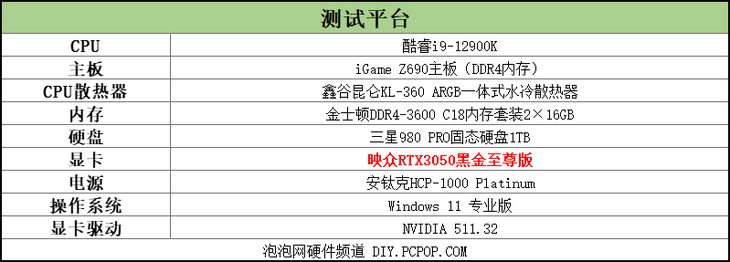 笔者组建了一套性能出色的酷睿i9-12900K测试平台,用来测试显卡的性能。为了对比映众RTX3050黑金至尊版显卡的性能,笔者此次测试还加入了RTX2060显卡的成绩,该RTX2060显卡是非公版的。