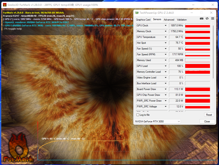 笔者继续利用 FurMark 这款烤机软件,继续对显卡的功耗进行了测试。显卡的实时功耗可以用 GPU-Z 这款软件查看。