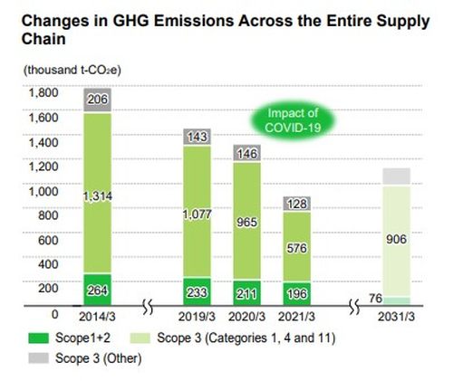为了有效推进低碳社会进程,实现可持续发展目标,尼康公司根据温室气体协议(GHGP)计算整个供应链中的温室气体排放量。2021财年,尼康范围1(Scope1)*1的二氧化碳排放量为33,891吨,范围2(Scope 2)*2为161,824吨。此前尼康计划通过公司业务活动,使温室气体排放量与2014财年相比减少18.2%以上。根据最新数据显示,截至2021年3月31日,温室气体排放量下降25.9%,尼康圆满完成目标。此外,范围3(Scope 3)*3排放总量为703,873吨二氧化碳,同比显著减少。其中第1类(购买的商品和服务)、第4类(上游运输和分销)和第11类(销售产品的使用)排放量下降尤为显著。尼康分析认为,随着世界经济的复苏,各领域产品销售额将明显上升,预计范围3(Scope 3)排放量将有所增加。尼康将继续采取节能减排举措,努力实现可持续发展的目标。