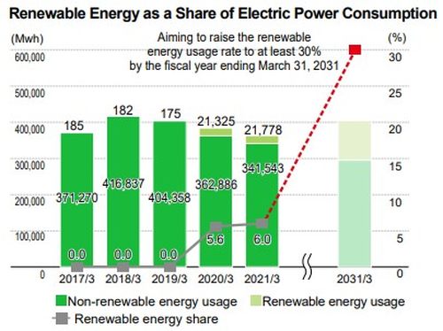 根据环境行动计划,尼康集团为各子公司和每个业务设施都设定了温室气体减排目标,通过各部门的团结协作减少温室气体排放。尼康努力提升产品开发和生产流程效率,以减少因能源消耗而产生的二氧化碳排放量。因由节能措施的有效落实和可再生能源的利用等因素,2021财年能源消耗排放总量为179,626吨二氧化碳,与上年相比大幅下降。2021财年,尼康可再生能源电力消耗占比已达6%,相当于减少了9,465吨的二氧化碳排放。未来计划通过内部电力循环、电力规划和绿色能源证书等手段,在2031财年末之前将与电力消耗相关的可再生能源使用率提高至30%以上。