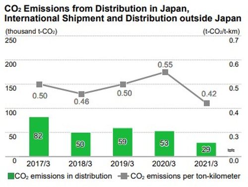 日本境内配送、国际运输和日本境外配送产生的二氧化碳排放量