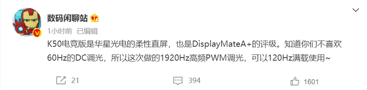 2月11日,@数码闲聊站在微博透露,K50电竞版采用华星光电的柔性直屏,也是DisplayMateA+的评级,屏幕支持1920Hz高频PWM调光,可以120Hz满载使用。