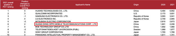 OPPO位列2021年全球PCT国际专利申请排行榜第六位