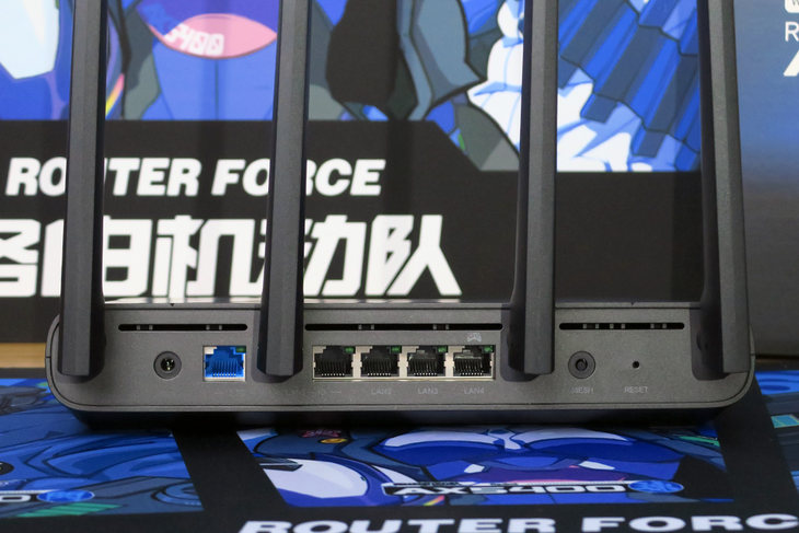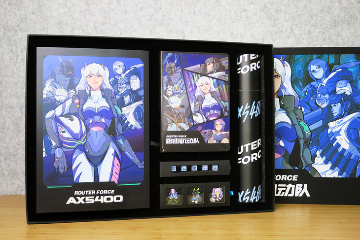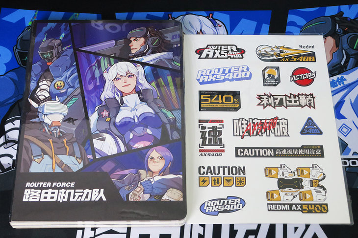 先看产品。笔者此次收到的Redmi 电竞路由器 AX5400是媒体专属版。除了路由器本身之外,媒体专属版还配了一套《路由机动队》的纪念礼盒。