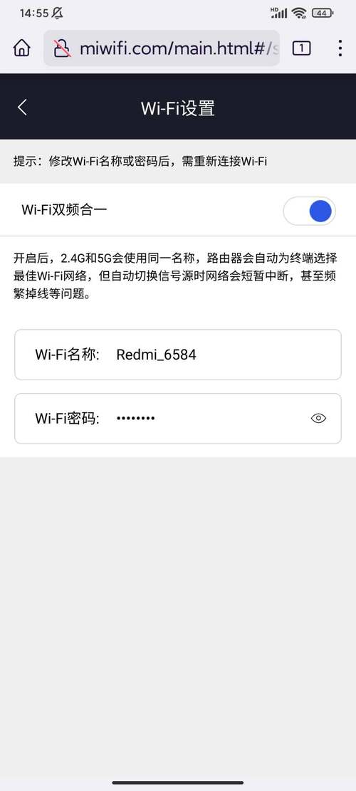 Wi-Fi设置界面。这款电竞路由器的Wi-Fi双频合一功能是默认开启的。