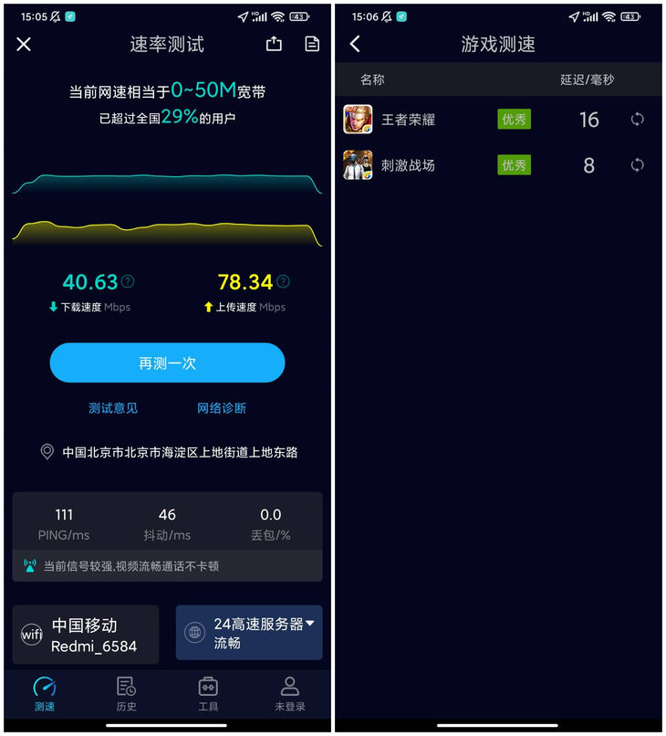 笔者接着换到了另外一个房间,大约与Redmi 电竞路由器 AX5400有着15米的距离。此时测得的下载速度可达40.6Mbps,上传速度可达78.3Mbps。Speedtest5g游戏测试项目《王者荣耀》为16ns延迟,《刺激战场》为8ns延迟。
