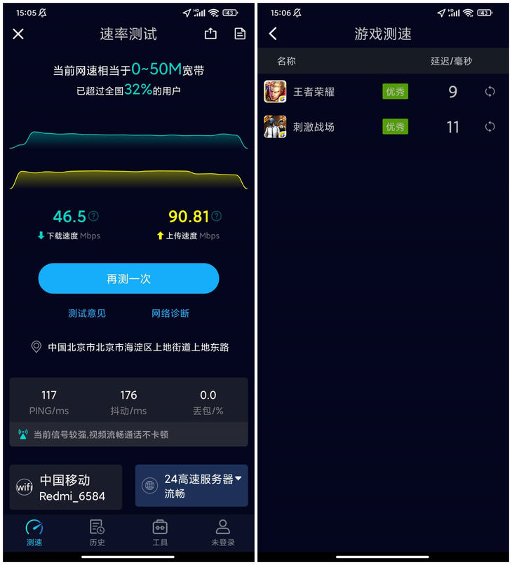 在与Redmi 电竞路由器 AX5400非常近的情况下,大约有2米的距离,笔者测试的下载速度可达46.5Mbps,上传速度可达90.8Mbps。Speedtest5g游戏测试项目《王者荣耀》为9ns延迟,《刺激战场》为11ns延迟。