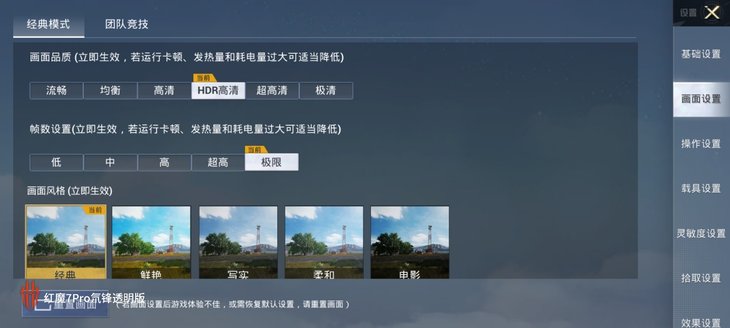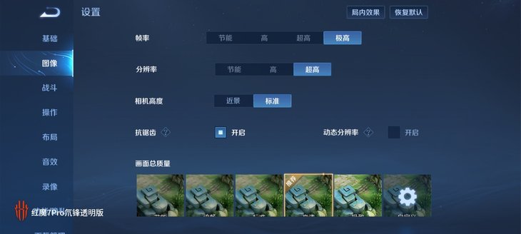 《王者荣耀》游戏画面设置支持极高帧率(120帧)+超高分辨率组合,其它特效全开。