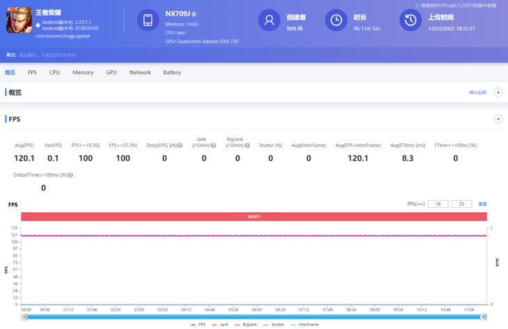 PerfDog软件记录到《王者荣耀》平均帧数为120.1帧,几乎就是一条没有任何波动的直线,即使是120帧模式也毫无压力,流畅度完全不用担心。
