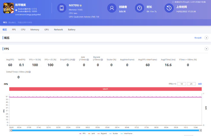 在《和平精英》游戏测试中,画面为HDR高清+极限帧数(60帧)设置组合,目前还没法开启高帧模式。PerfDog软件记录到的平均帧数为60帧,同样能保证流畅的画面效果。