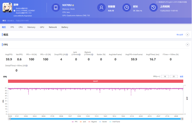 PerfDog软件记录到的平均帧数为59.9帧,在30分钟连续测试中,因为场景切换以及人物死亡时偶尔才出现稍大的波动,整体帧数波动都很小,基本维持在满帧状态,画面流畅度非常好,《原神》能有这样的表现是十分难得的,带来相当出色的游戏体验。