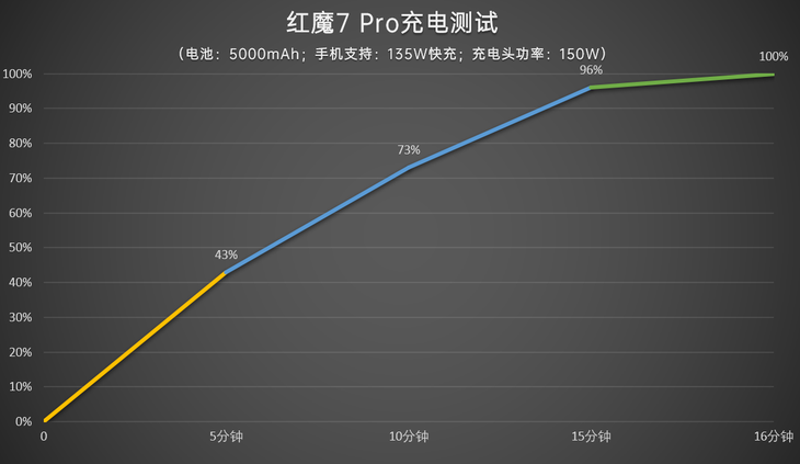 电量耗尽自动关机后开始充电测试,5分钟就能达到43%的电量,10分钟达到73%的电量,达到100%的电量只需16分钟。得益于135W快充支持,即使配备了5000mAh大电池,红魔7 Pro的充电速度仍旧很快。游戏中场休息的几分钟就能充到不少的电量,降低续航焦虑。