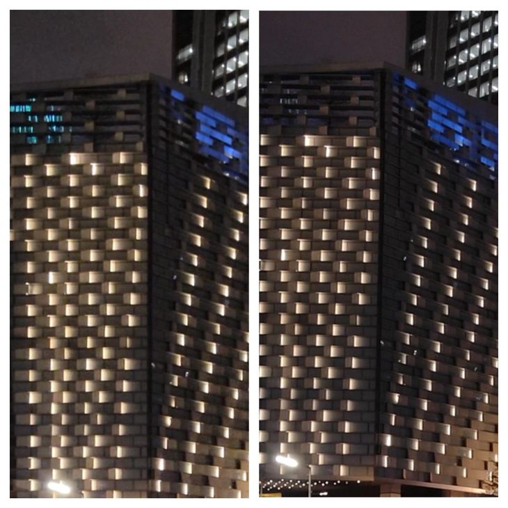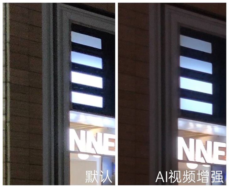 在夜间较暗的场景拍摄视频,开启AI视频增强后,画面纯净度得到大幅提升。从上面视频对比截图可以看到,天空部分画面噪点明显降低,楼宇线条更加清晰锐利,整体视频画面观感要提升不少。