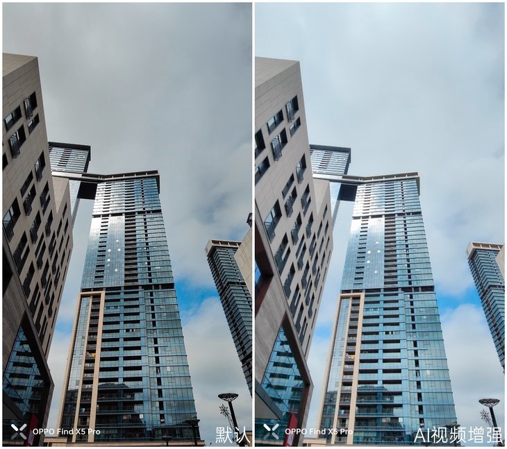 在部分大光比的白天场景,AI视频增强功能也能起到明显提升作用。上面为逆光场景拍摄,虽然默认模式楼宇同样能得到适当曝光,呈现不错的细节,但很容易看到画面上有不少的噪点和杂色,影响整体画面观感。开启AI视频增强后,画面基本没有明显的噪点和杂色,纯净度大幅提升,画面质感更加出色。