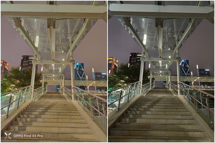 在夜拍场景,OPPO Find X5 Pro对色彩的还原也比较准确。OPPO Find X5 Pro的样张更接近实际环境色彩,右边对比的安卓旗舰手机白平衡偏冷色调。值得一提的是,无论是默认或者夜景模式拍摄夜景照片,大部分场景的成像速度都非常快,不需要等待很长时间。