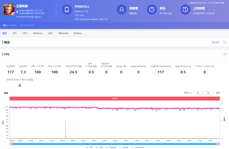 《王者荣耀》支持120帧高帧模式,其余特效全开。PerfDog软件记录到的平均帧数为117帧,虽然在游戏多人对战等场景帧数会有小幅波动,但仍旧能提供非常流畅的画面效果,加上响应迅速的触控操作,游戏体验出色。游戏全程温度控制得很出色,不会有很烫手的感觉。