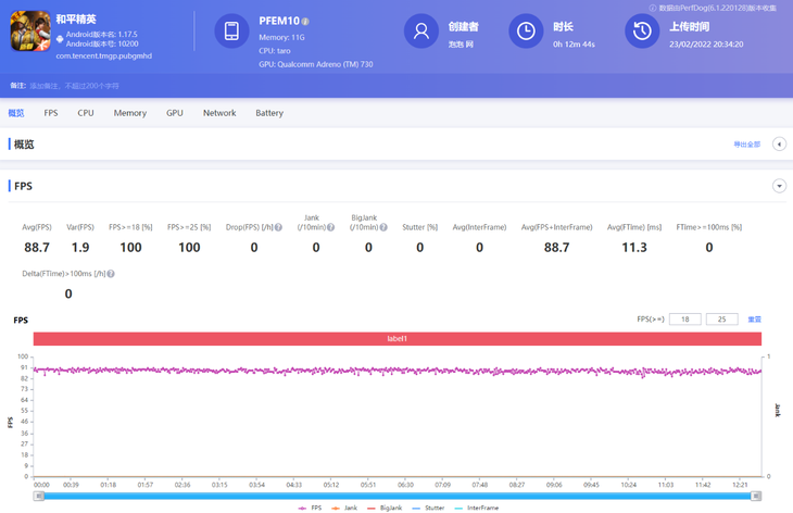 《和平精英》PerfDog软件帧率测试结果△