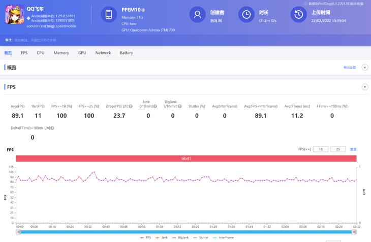 此外,《QQ飞车》也支持高帧模式,PerfDog软件记录到的平均帧数为89.1帧,《使命召唤手游》游戏平均帧数为59.7帧,都能保证很好的画面流畅度。
