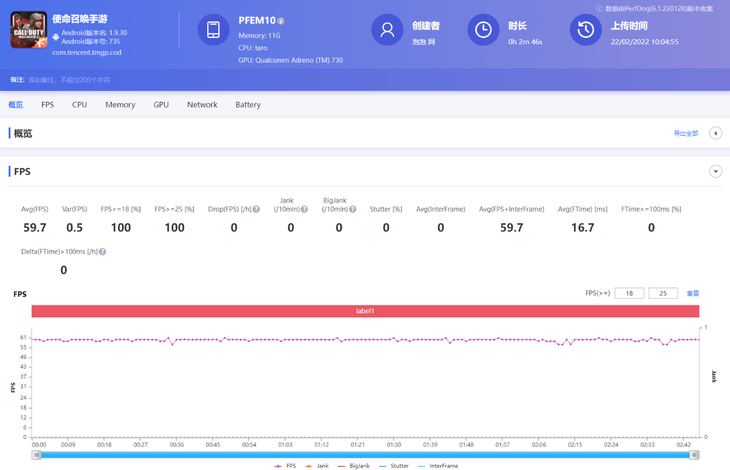 《使命召唤手游》PerfDog软件帧率测试结果△
