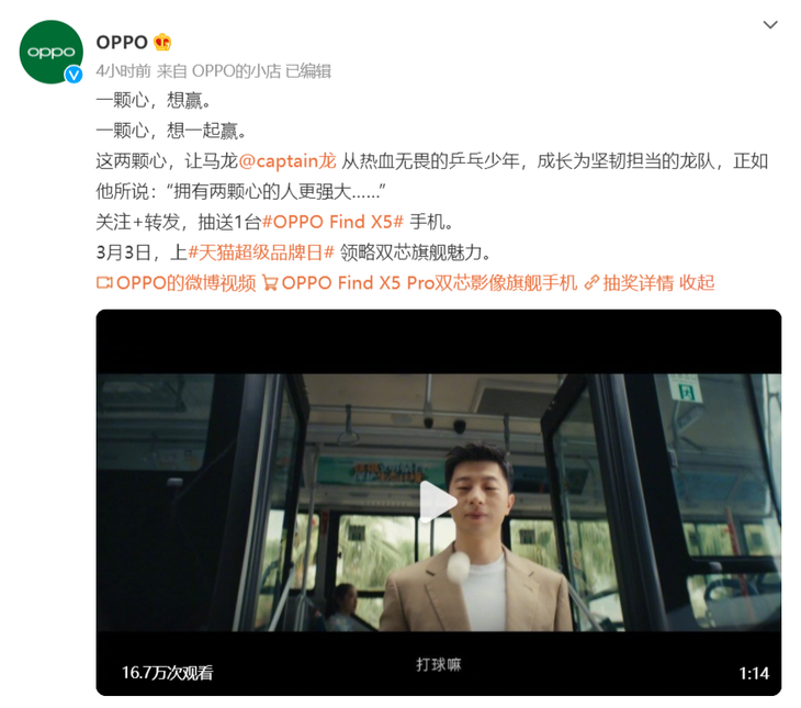 3月2日,OPPO官方宣布,中国乒乓球奥运冠军马龙担任OPPO Find X5系列双芯探索家,一起探索两颗心的无限可能,同时公布了《马龙的两颗心》主题影片。