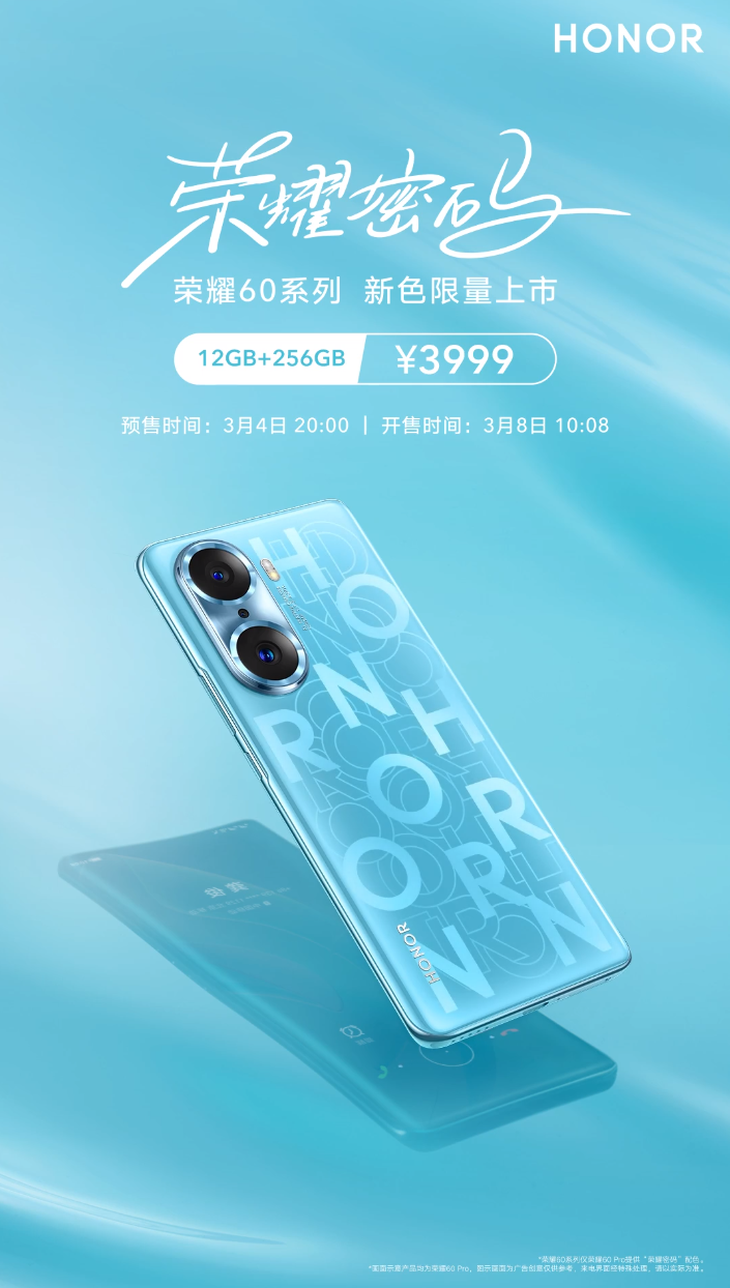 荣耀60 Pro荣耀密码新配色公布,3999元
