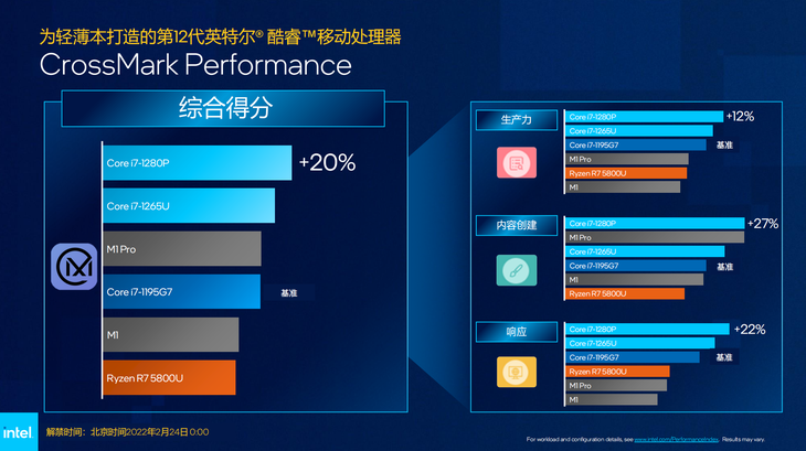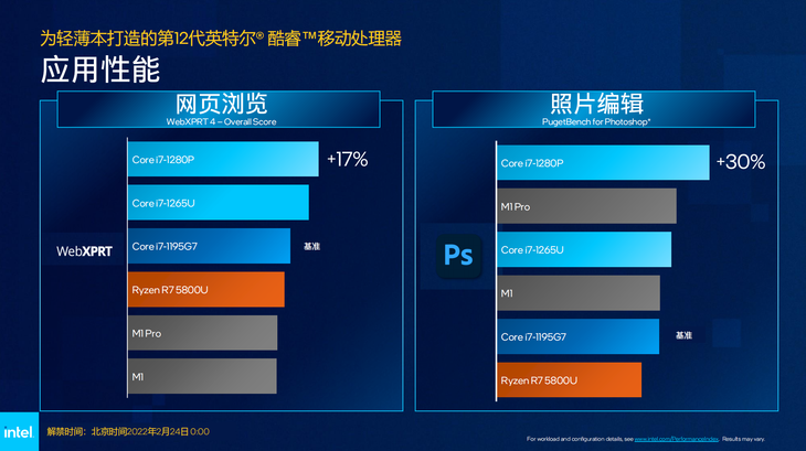 根据英特尔的官方数据,在日常生产力的表现上,12代酷睿P系列“准标压”处理器的主力型号酷睿i7-1280P能够明显与12代酷睿U系列低压处理器酷睿i7-1265U拉开性能差距。