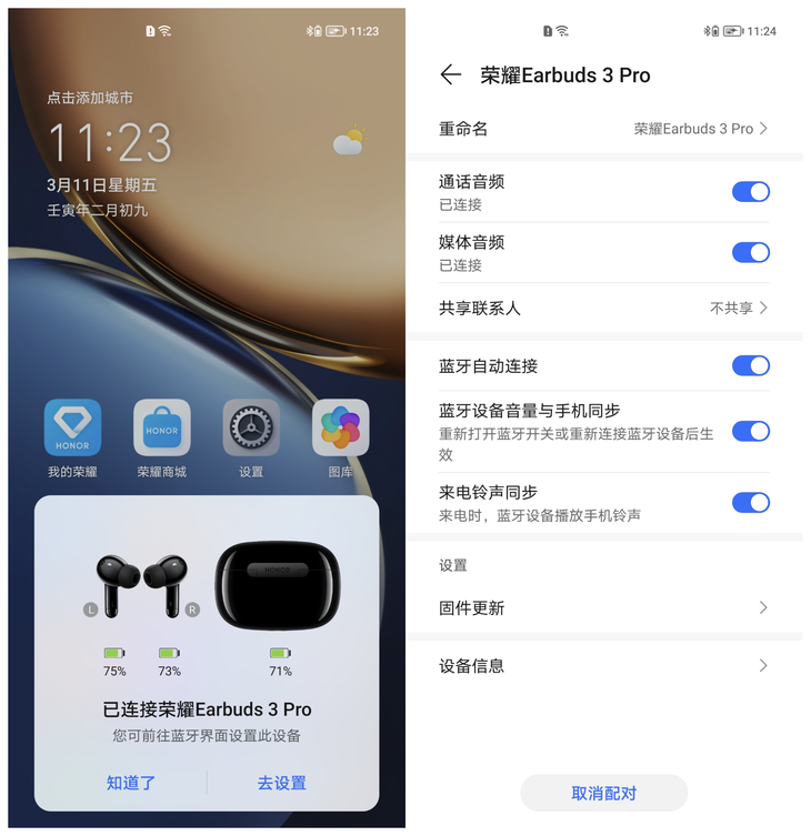 如果你使用的是荣耀手机,那么开启手机蓝牙后,当打开充电盒盖的时候,手机就会弹出连接提示,可以一键完成连接。
