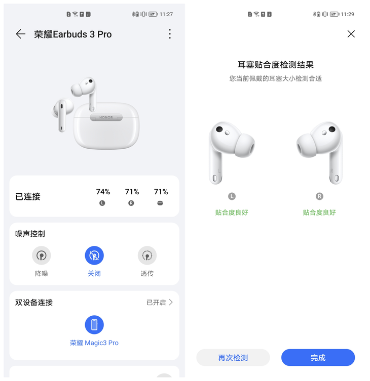 荣耀Earbuds 3 Pro支持触控以及滑动等操作,可以实现播放/暂停,音量调整等功能。当开启降噪时,如果需要与他人沟通,那么也可以通过触控的方式开启耳机的通透模式,可以更清晰的听到外界的声音。