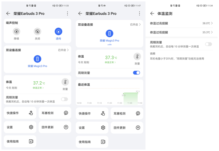 当用户佩戴荣耀Earbuds 3 Pro达到5分钟后,就可以开始通过耳机来进行测温,可以进行单次测温,也可以设定10分钟的测温周期,用户可以在手机中查看温度情况。