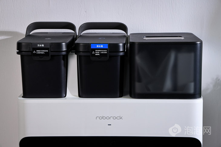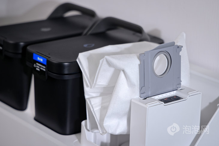 基站顶部的三个箱体分别是污水箱、清水箱以及及集尘桶,集尘桶采用了半透明的箱体设计,也便于用户观察集尘袋的情况,即使对集尘袋进行清理。石头自清洁扫拖机器人G10S Pro的集尘袋尺寸达到了2.5L,基本可以满足60天的集尘需求。