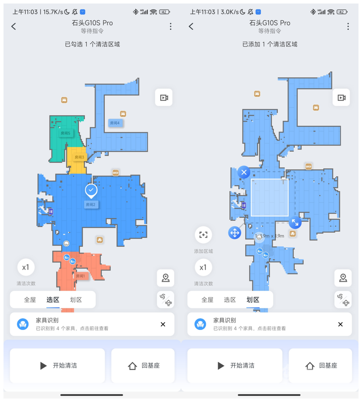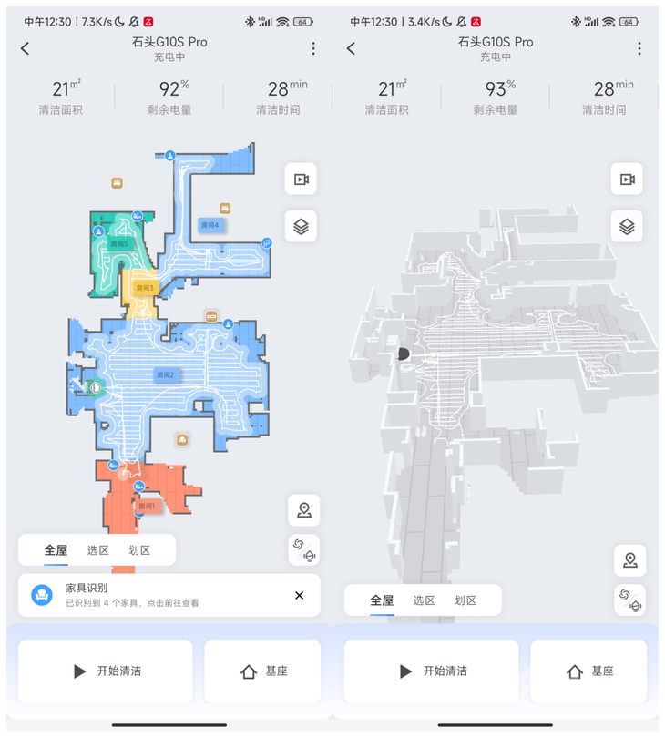 在清扫过程中,石头自清洁扫拖机器人G10S Pro结构光主动测距避障功能,达到毫米级3D结构光测距,并融合AI算法,可实现家具、地面材质、障碍物识别的功能,识别后可在app中标识出来,AI结构光主动测距避障效果更出色。
