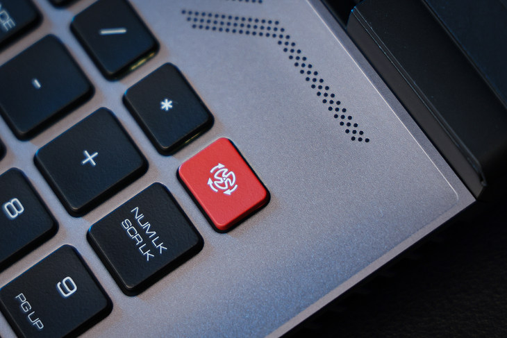 键盘面的右前方,还集成了“一键强冷”按键,其采用了橙色涂装设计,很醒目。开启一键强冷功能后,散热器转速将达到最快,同时会伴有比较大的运行声音。运行超高负载应用程序的时候建议开启此功能。