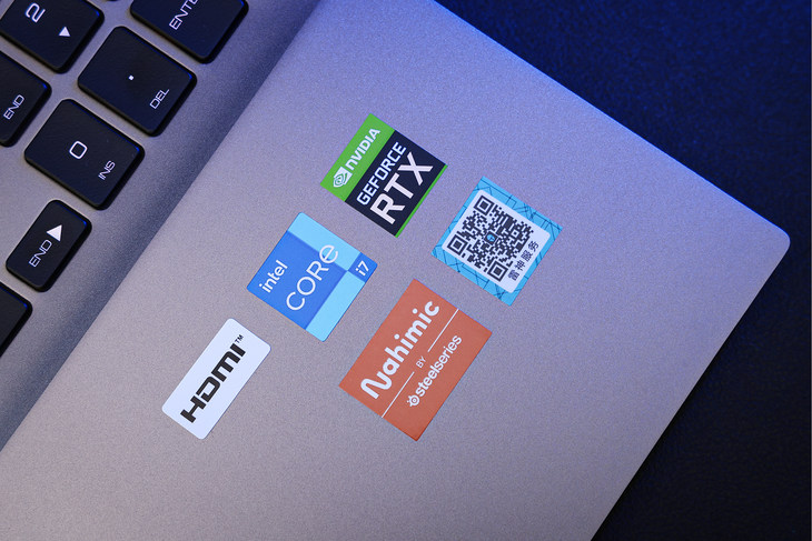 右侧掌托上面贴有英特尔处理器、NVIDIA显卡、Nahimic的品牌贴纸,以及雷神服务的二维码。