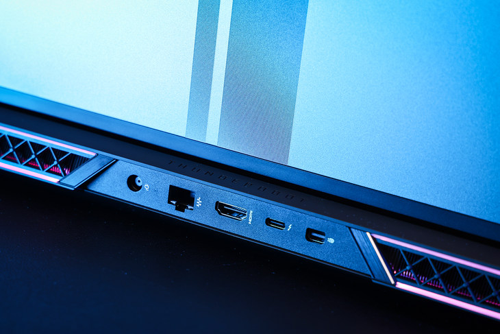 机身后部还设计了电源接口、网线接口、一个HDMI2.0接口、一个雷电4接口、一个迷你DP1.4接口。
