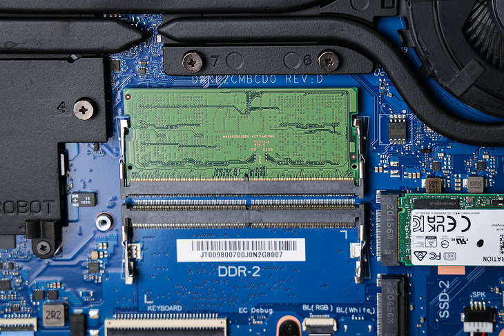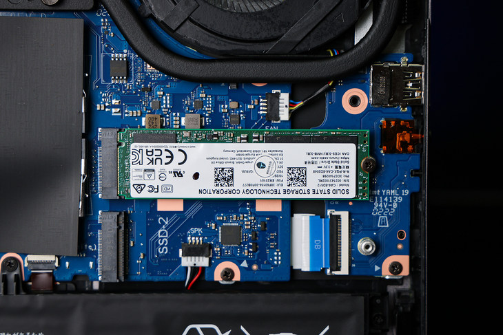 PCIe4.0固态硬盘为SSSTC出品的,也就是建兴,目前在铠侠旗下,硬盘容量为512GB。同时,这款游戏本还预留了一处M.2固态硬盘安装位,标准M.2 2280尺寸,同样支持PCIe4.0 CPU直连,玩家可以自行扩展硬盘容量。